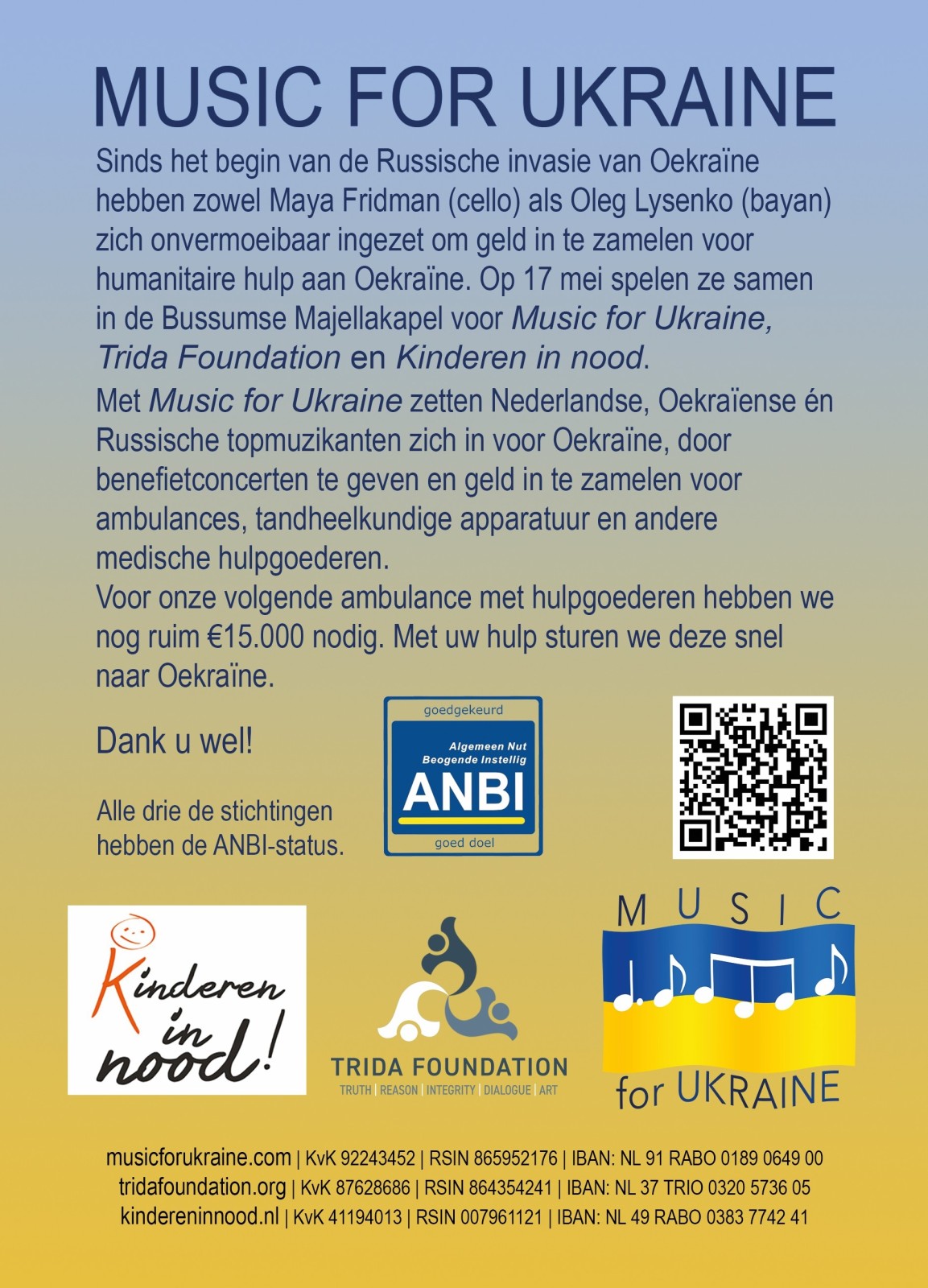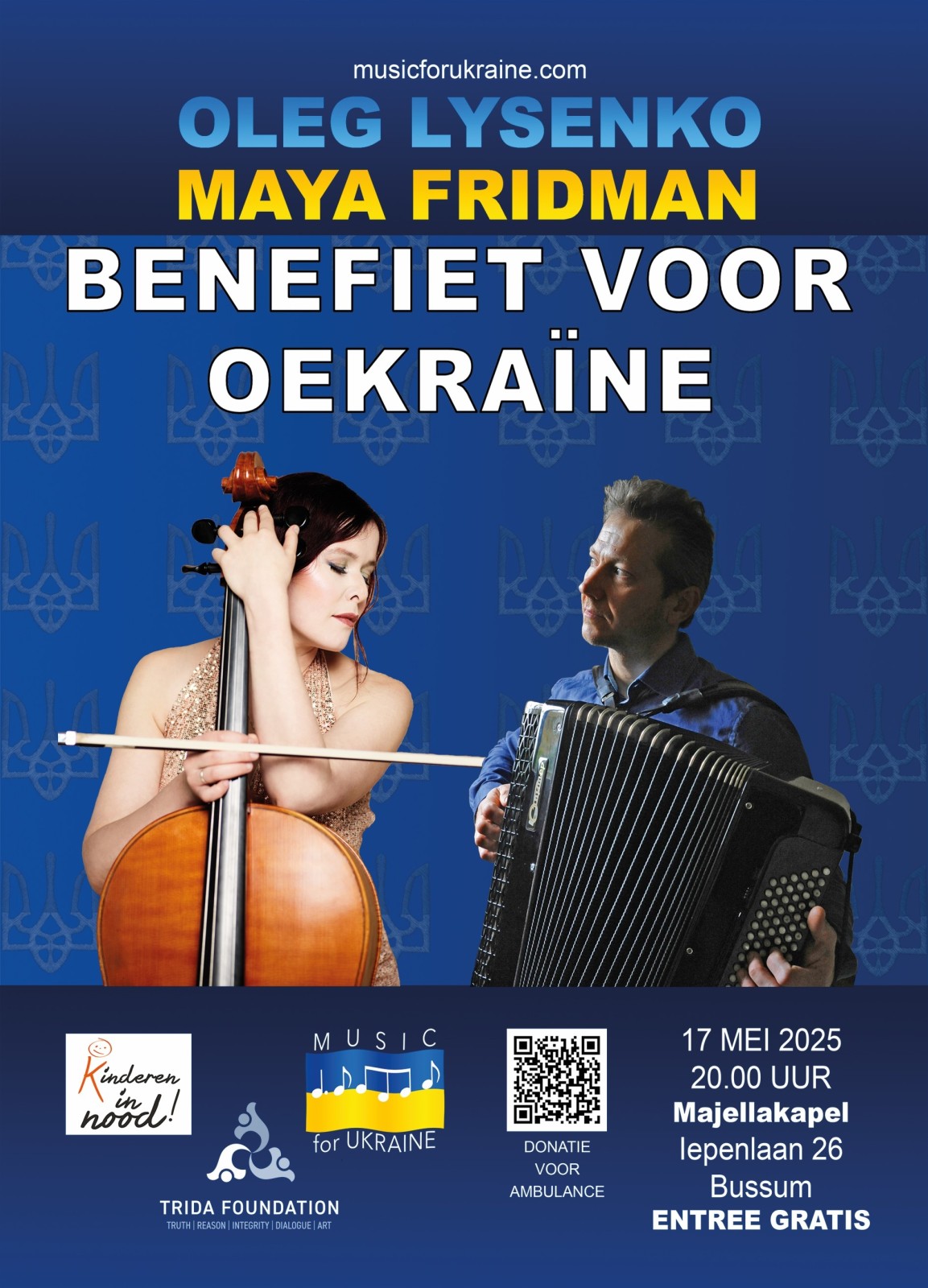 Kinderen in Nood organiseerde samen met bayanist Oleg Lysenko en celliste Maya Fridman een benefietconcert in Bij Andreas in Naarden Vesting. De toegang was gratis, en bezoekers konden een vrijwillige financiële bijdrage doneren waarmee de aanschaf van een ambulance en medische apparatuur wordt gefinancierd. Inmiddels zijn er al 13 ambulances aangeschaft. Kinderen in Nood heeft inmiddels drie keer financieel bijgedragen aan de aanschaf van ambulances. De ambulances worden door vrijwilligers naar ziekenhuizen in Oekraïne gebracht en worden ingezet bij het vervoer van gewonde Oekraïners.