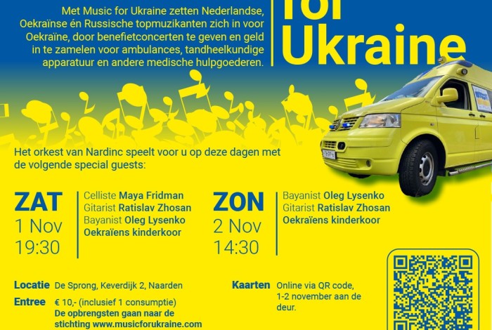 💛 Waarom dit concert telt: de opbrengst gaat volledig naar Stichting Music for Ukraine. We zamelen geld in voor een nieuwe ambulance vol medische hulpgoederen. Er is nog ruim €18.000 nodig – en uw aanwezigheid maakt het verschil.