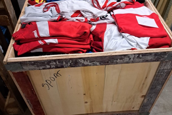 Vier kratten met bedrijfs- en sportkleding klaar voor transport