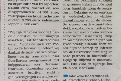 De Stichting Kinderen in Nood uit Bussum heeft afgelopen vijf maanden € 172.000 aan financiële donaties binnengekregen. € 141.000 is hiervan inmiddels voor Oekraïne besteed.